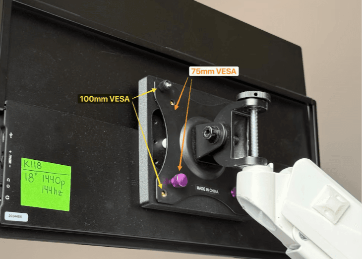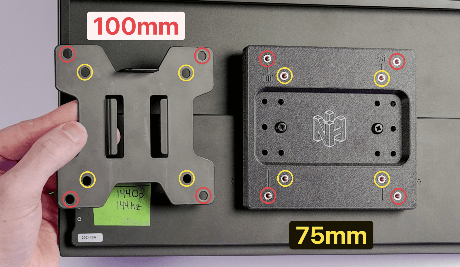 Depending on your VESA mount or arm, you can choose to use either the 75mm or 100mm mounting holes.