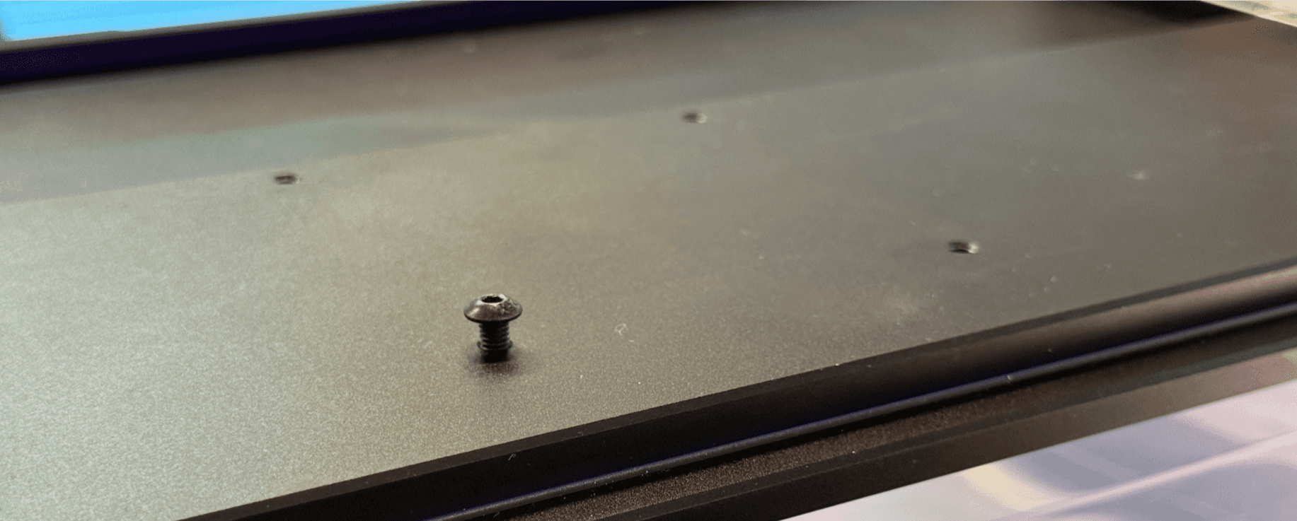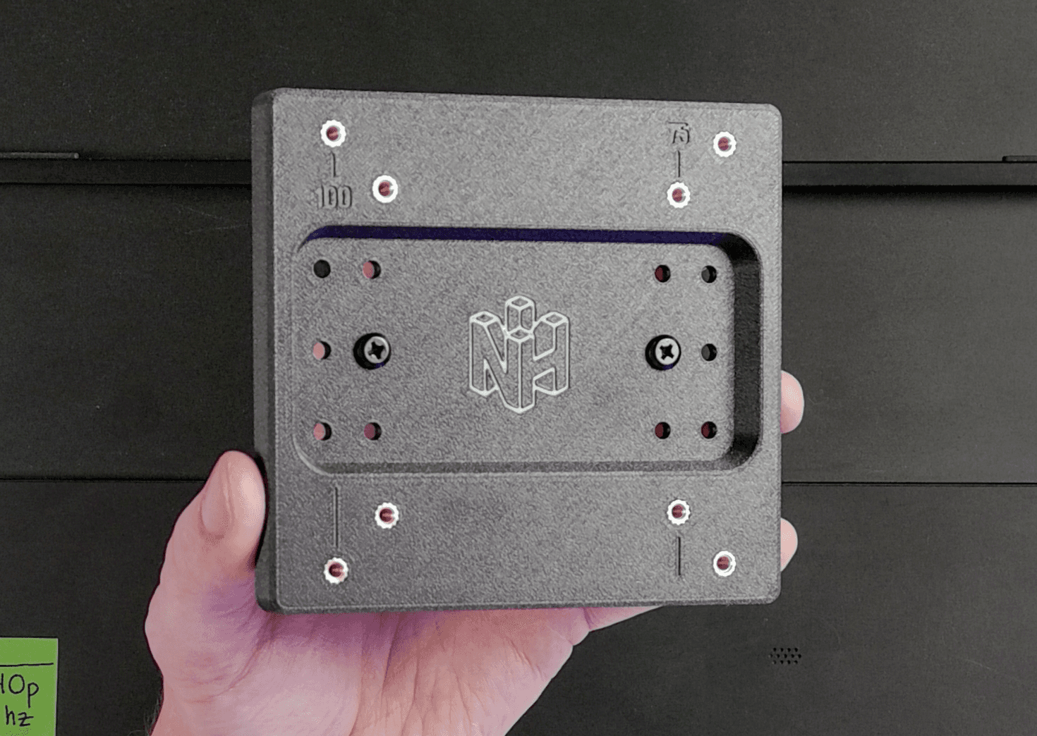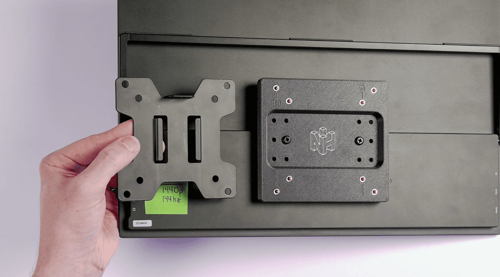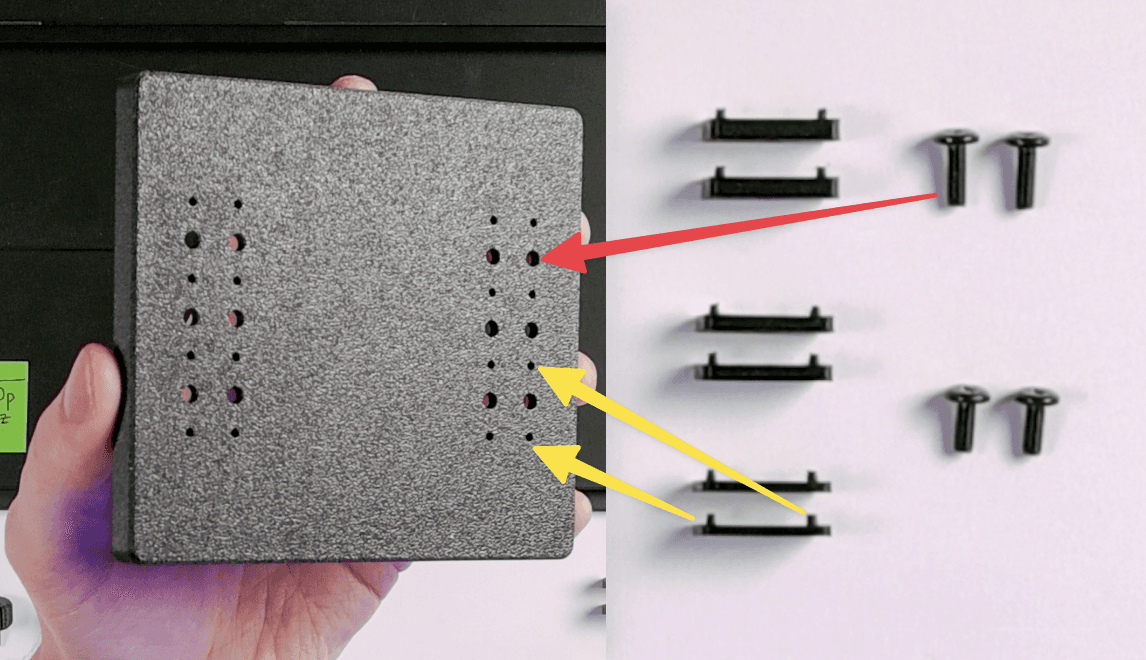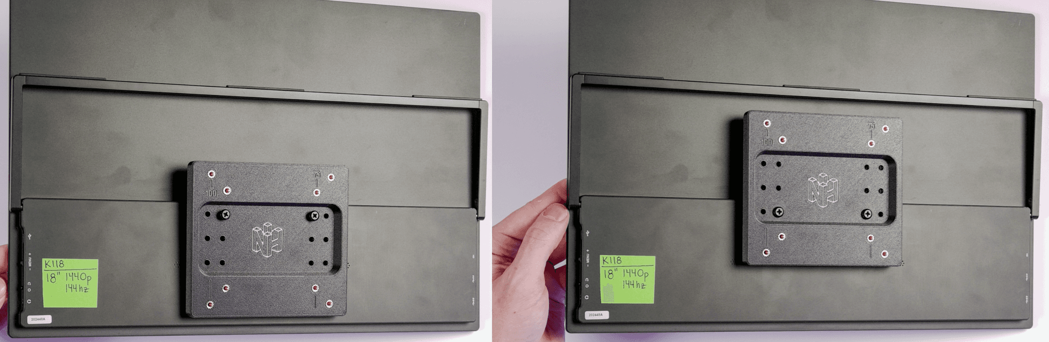 Take the black phillips head M4x8mm screws and insert them into the holes. Depending on your portable monitor and VESA mount, you choose to either mount using the 100mm VESA standard, or the 75mm VESA standard.