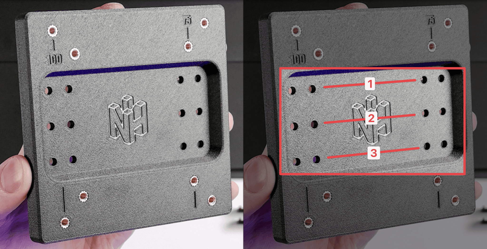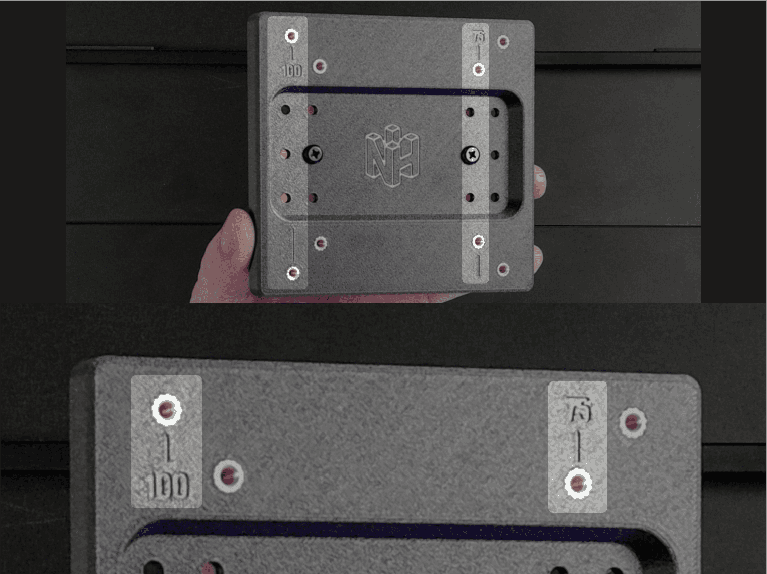 There are three different sets of holes that you can use when connecting this adapter to your portable monitor. These are designed to give the user control over the height of the mount, or in case the adapter comes in contact with monitor that prevents mounting. If you're unsure which set to use, just use number 2.